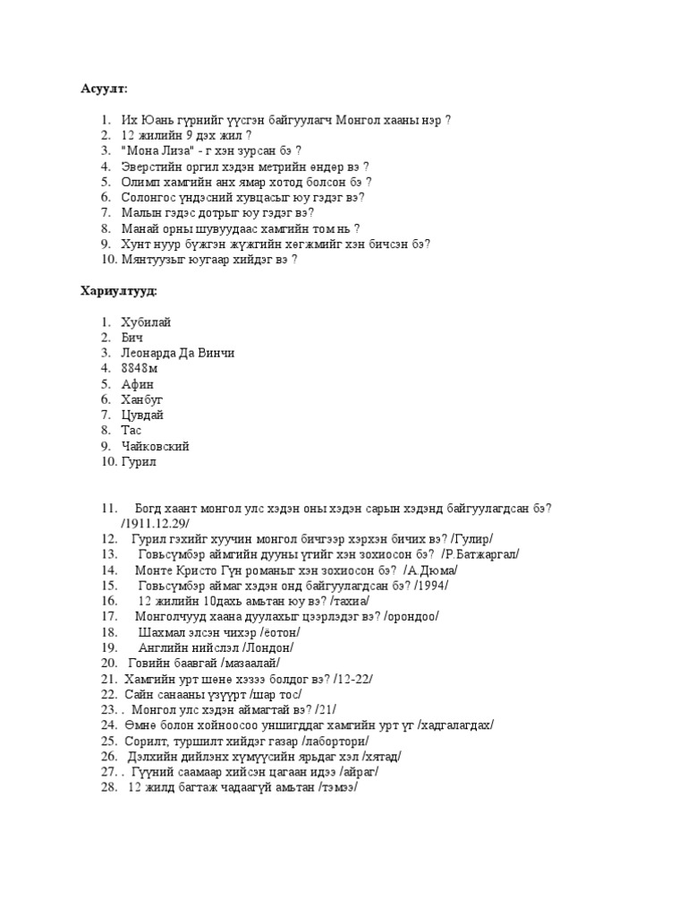 Tany Logik SetgehÒ¯jg Shalgah Adal Yavdaltaj 10 Taavar from seruuleg.mn Get in touch with asuult hariult (@nymzaya0302) — 64 answers, 65 likes. Ask anything you want to learn about asuult hariult by getting answers on askfm. Видео asuusand hariullaa | asuult hariult канала tsenguun's channel. Legends legends 12 views9 months ago. 0up votes, mark as useful. 3, 7 niilj 1r durs, 4,2 niilj 6r durs, 8,9 durs niilj 5r dursiig buteene. Learn vocabulary, terms and more with flashcards, games and other study tools. Hamgiin rhniih ni zuv hariult bn.